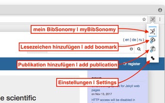 BibSonomy Buttons Plugin is an add-on for users of the blue social bookmark and publication sharing system BibSonomy. This plugin adds three useful BibSonomy control buttons to your browser, allowing for quick and easy access to your myBibSonomy page, as well as the ability to store bookmarks and publications with just a click of a button or by using keyboard shortcuts.